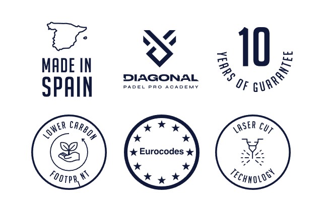 Selon les normes de la Fédération Internationale de Padel pour le verre trempé, 12 mm d’épaisseur avec bord plat poli, avec une planimétrie parfaite et entièrement homologué selon les designs WPT, Premier Padel et APT : 18 verres de 2995 x 1995 mm, avec trous fraisés (108 m²).